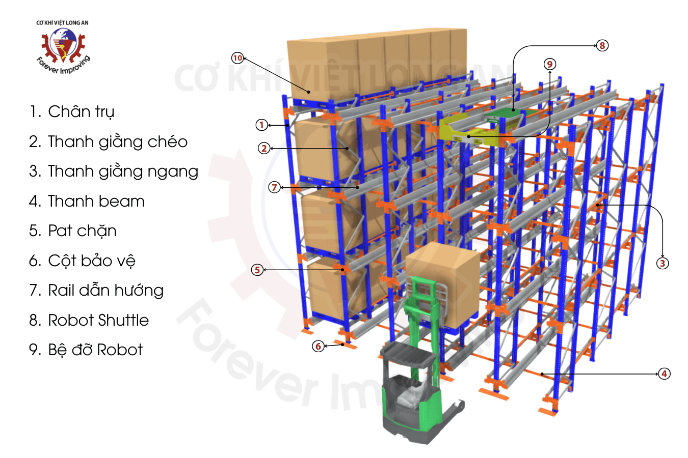 - Sử dụng xe nâng để di chuyển shuttle giữa các tầng kệ